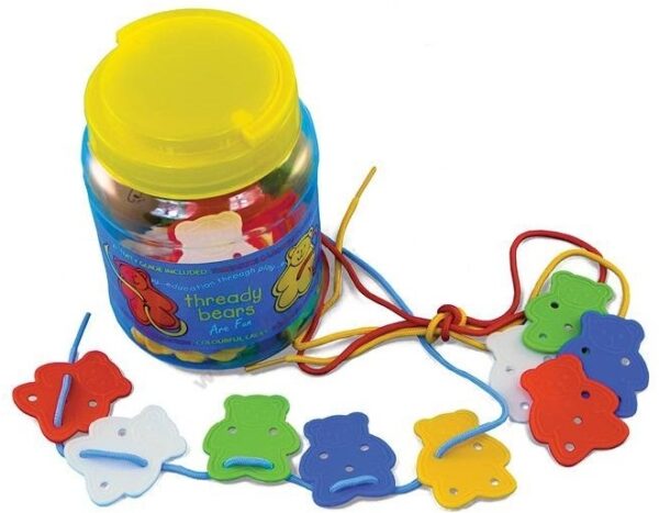 Bear-shaped elements for lacing, sorting and counting. The set includes: 3 laces, 50 elements, plastic bucket; ages: 3+