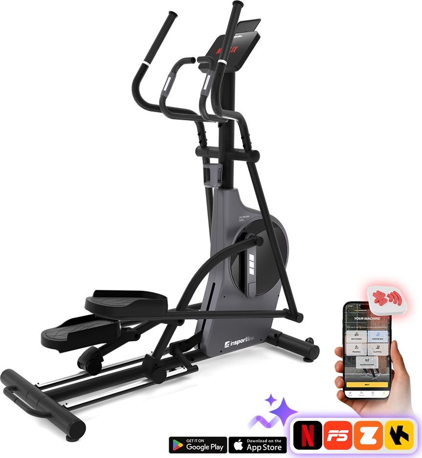 The inSPORTline ZenStride 600 elliptical trainer is the perfect combination of modern technology, comfort and effective training. It features a 9 kg weight wheel, smooth running, 32 resistance levels, adjustable 8.5° stroke, weight capacity up to 135 kg and electronic load control. With a 10.1″ TFT display with pre-installed apps, Bluetooth connectivity and compatibility with Kinomap, Zwift and FitShow, home workouts become an interactive experience full of challenges and fun.