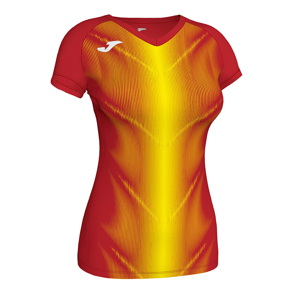 V-neck t-shirt with mesh fabric in the armpits to provide added perspiration. Sublimation print on the front. Embroidered logo.