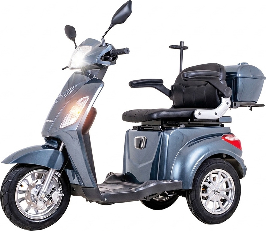 Since it’s an electric scooter, it’s quiet and therefore environmentally friendly. And to top it all off, you can drive it without a driver’s license! The seat is comfortable; and thanks to the folding armrests, you can easily take a seat even if you’re physically disabled. There are two storage boxes in the back, in which you can put your shopping bags or smaller luggage. You might also appreciate the loud security alarm which will keep thieves at bay.