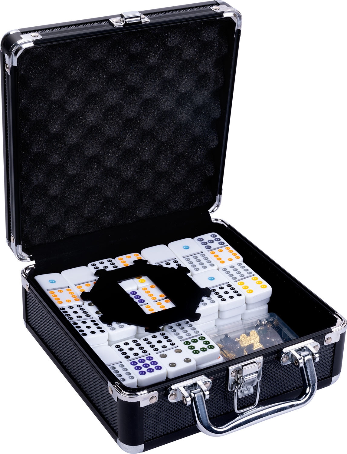 De Longfield Mexican Train Dubbel 12 is een complete set Mexican Train domino, inclusief kunststof stenen, kunststof station, metalen treinen en een zwarte aluminium koffer om het spel in stijl mee te nemen en op te bergen. De 91 kunststof stenen met gekleurde ogen lopen op tot een waarde van 12. Het spel is geschikt voor zowel jong als oud en kan gespeeld worden met 2 tot 8 personen.