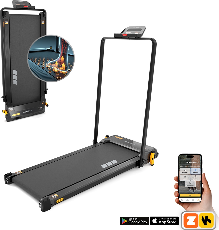 The inSPORTline ZenRun NOON is designed to be safe and comfortable for every household member. Younger users can enjoy a light run, while older users will appreciate the steady walking pace – supported by a safety handlebar for extra balance. And when it’s time to slow down, just flip the treadmill to the massage side for soothing relaxation – perfect for runners, walkers, or anyone looking to unwind. The foldable handlebar also makes it easy to store the treadmill when you need to free up space in your home.
