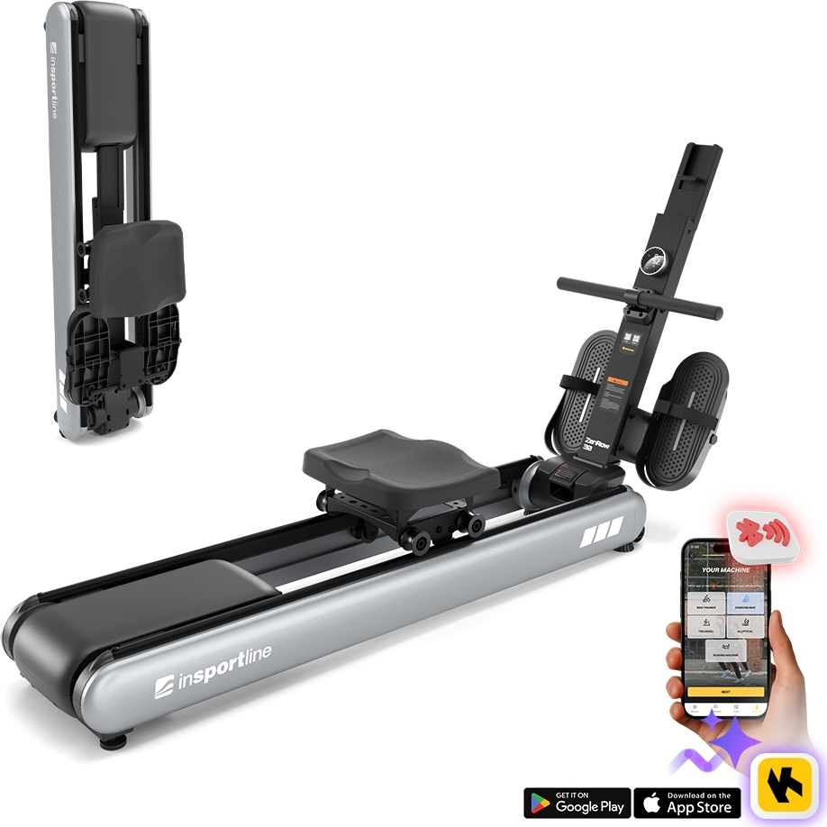 The Rowing Machine inSPORTline ZenRow 30 strikes the perfect balance between performance, comfort, and modern technology. Thanks to its silent magnetic braking system, electronically controlled resistance, and built-in generator, you can enjoy your workout anywhere – no power cords, no noise. The machine features 32 resistance levels, a rotating intuitive control panel with a display, and smart app connectivity – all in a sleek, foldable frame that saves space and fits perfectly in any home.