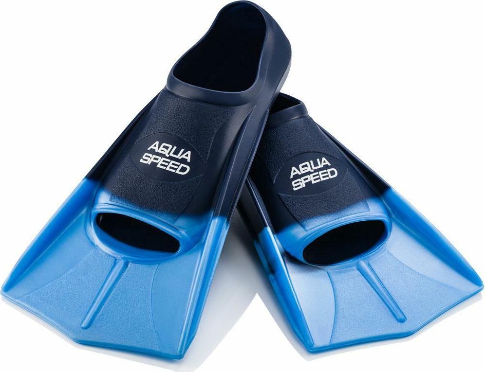 Short training fins made of highest quality soft and very flexible silicone material.  Aquaspeed training fins are perfect for all those who intend to improve their swimming technique, lower body strength and durability. Thanks to their design, they allow the swimmer to exercise leg movement very similar to the leg movement performed without any fins. Special reinforcing elements on the sides of the fins which begin at the foot pocket, apart from providing extra durability of the fins, channel water along the blades and reduce vibrations generated by the water flowing along the fins.  Aquaspeed traning fins greatly improve the efficiency of the legwork by providing greater thrust and by concentrating more energy on the legs, thus strengthening them.  Aquaspeed traning fins are perfect for schools, swim clubs and for individual customers who aim to improve their swimming technique and leg strength in their free time at a simming pool.